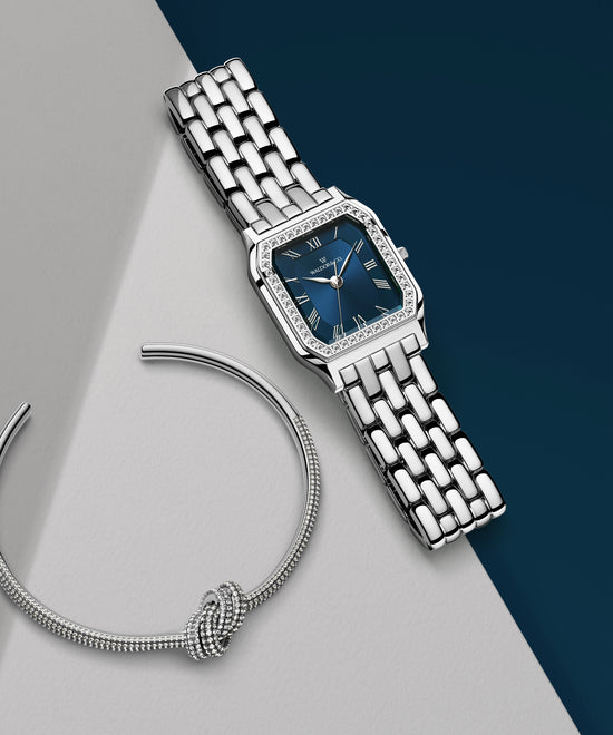 Cool silver tones meet a deep navy dial, creating a composed yet radiant expression of the Eternal 22 Bellagio Pavé.
