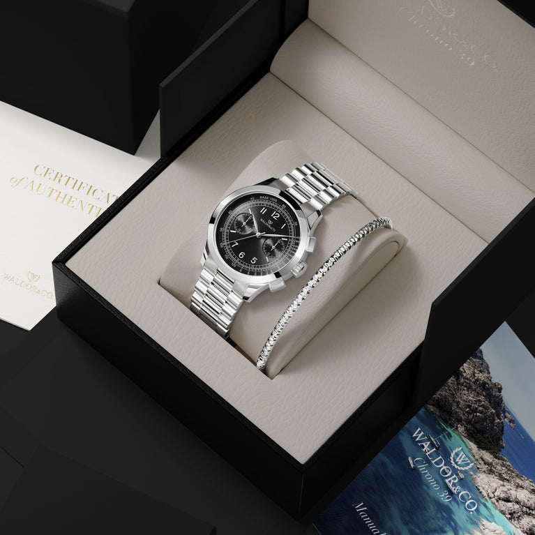 Packaging: Black box with beige leather interior, certificate and manual