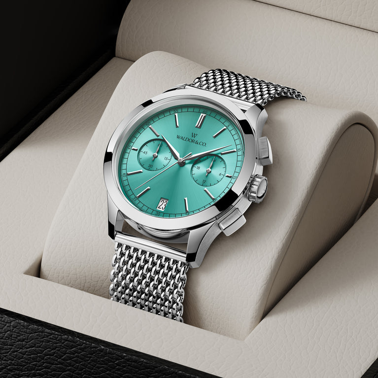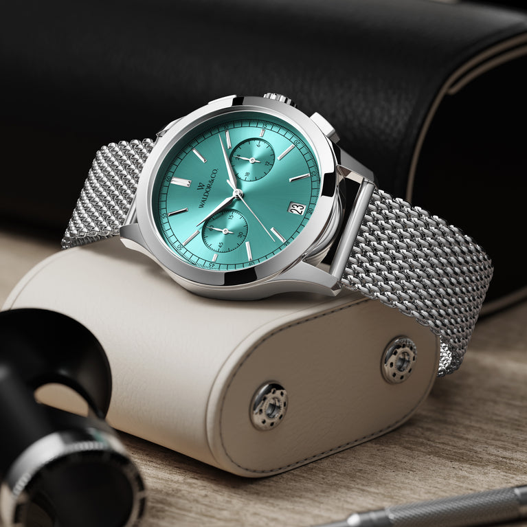 The vivid turquoise dial of the Chrono 39 Sardinia captures the essence of Sardinia’s crystal-clear waters, embodying the serene elegance of the Mediterranean. This unique shade is both vibrant and richly nuanced, crafted to catch the light and mirror the sun’s reflections on the ocean’s surface.
