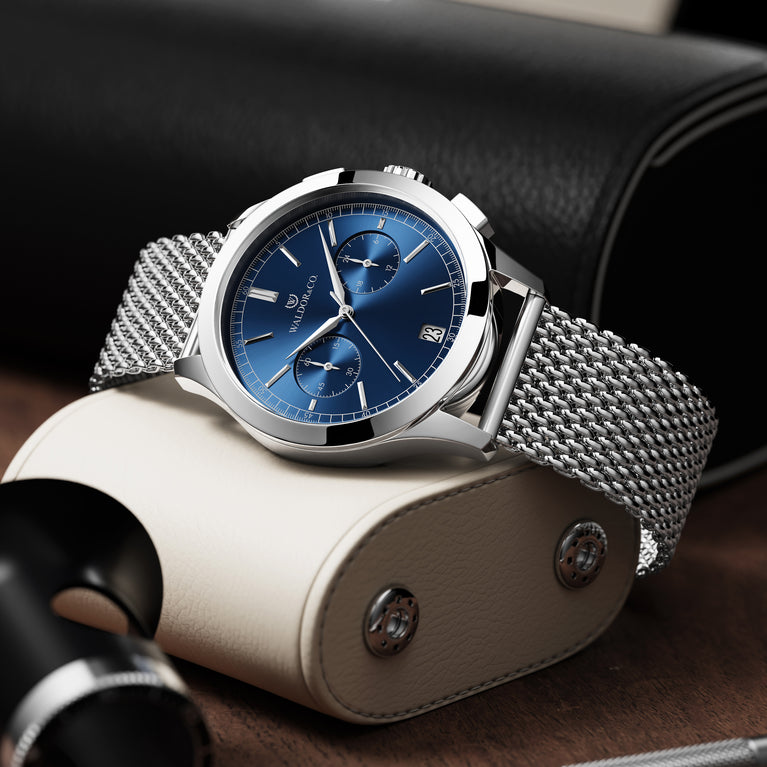 The striking blue dial of the Chrono 39 Sardinia is reminiscent of the crystal-clear waters of Sardinia, a nod to the exclusive and serene spirit of the Mediterranean. This particular blue is vibrant yet deep nuance, designed to catch and play with the light in a way that mimics the sun's reflections off the ocean's surface.